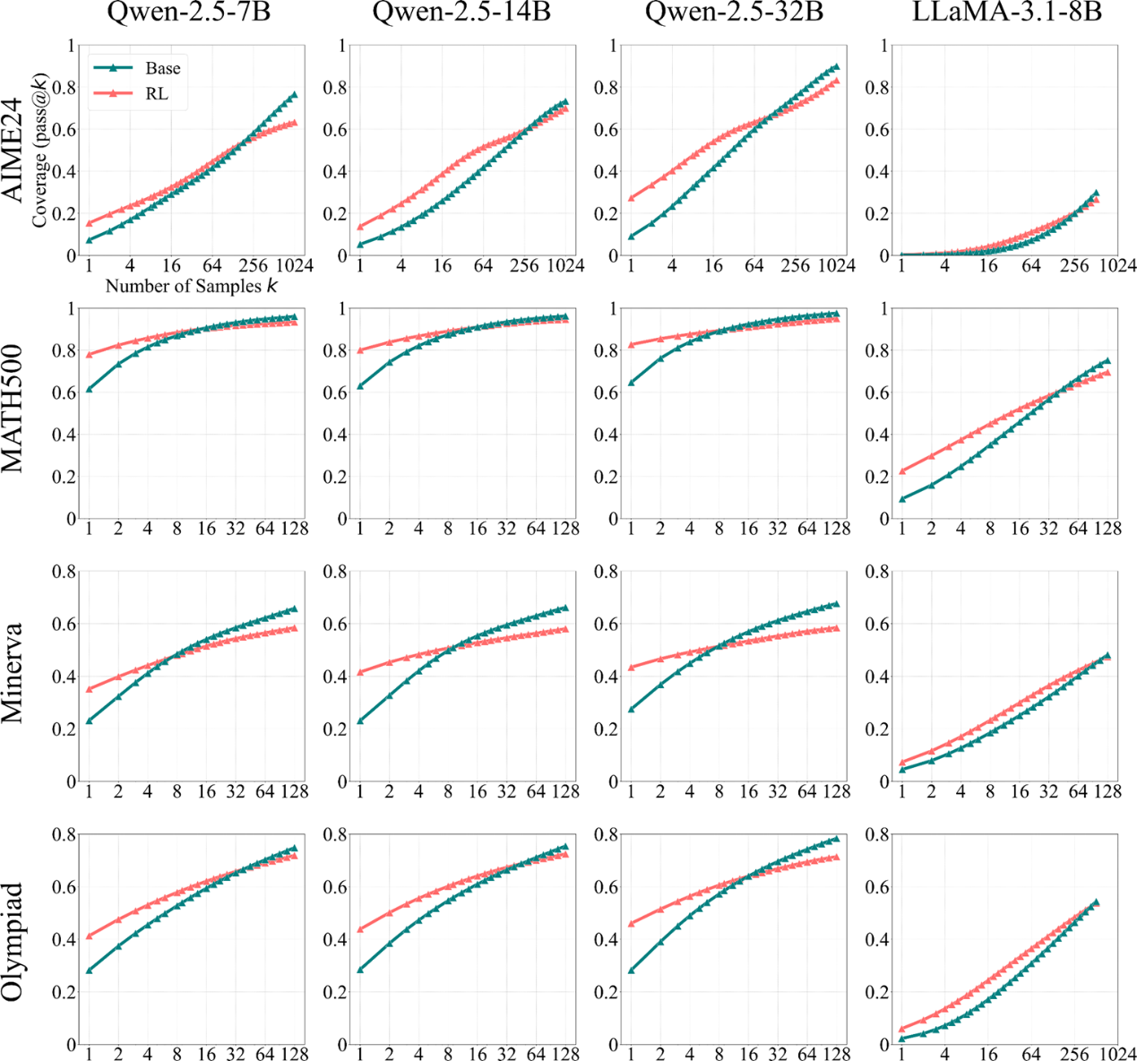 基座模型与 RLVR 模型在不同数学基准上的 pass@k 曲线对比