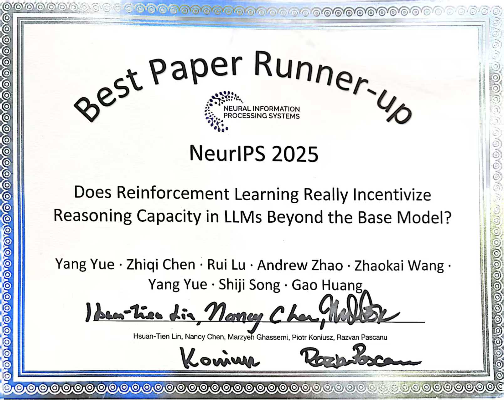 2025年12月6日,在美国圣地亚哥召开的第39届神经信息处理系统会议(Conference on Neural Information Processing Systems,NeurIPS)上,清华大学自动化系宋士吉、黄高团队的论文“Does reinforcement learning really incentivize reasoning capacity in LLMs beyond the base model?(强化学习是否真的能激发大语言模型产生超越基础模型的推理能力?)”荣获Best Paper Runner-Up Award(最佳论文亚军奖)。NeurIPS为人工智能领域历史最悠久、最具影响力的学术会议之一,今年共收到21575篇投稿,录用论文5290篇,其中7篇论文获得最佳论文奖或最佳论文亚军奖。该论文是 NeurIPS 自设立大会最佳论文奖或杰出论文奖以来,首篇完全由国内高校学者组成的研究团队完成的获奖成果。
