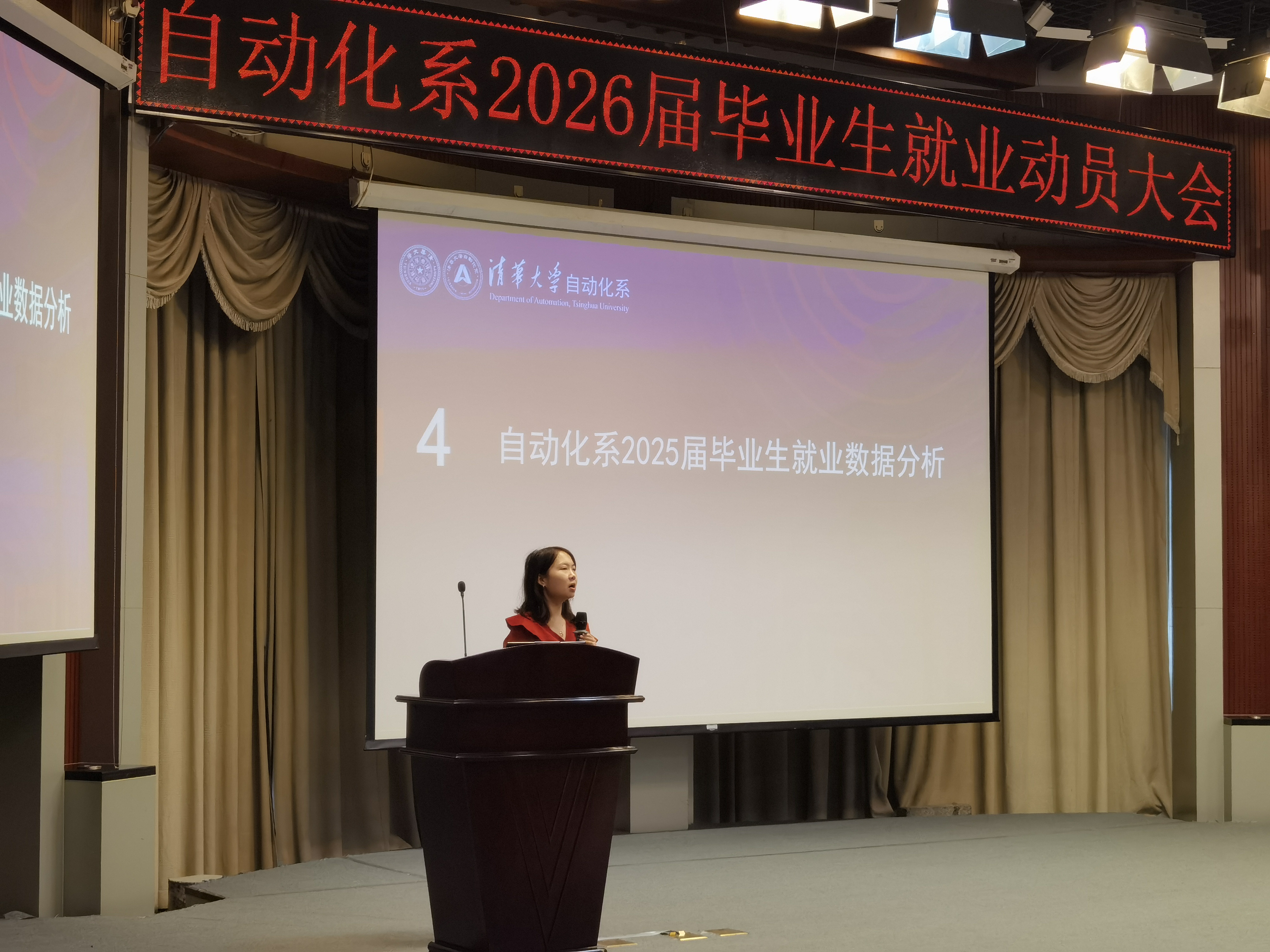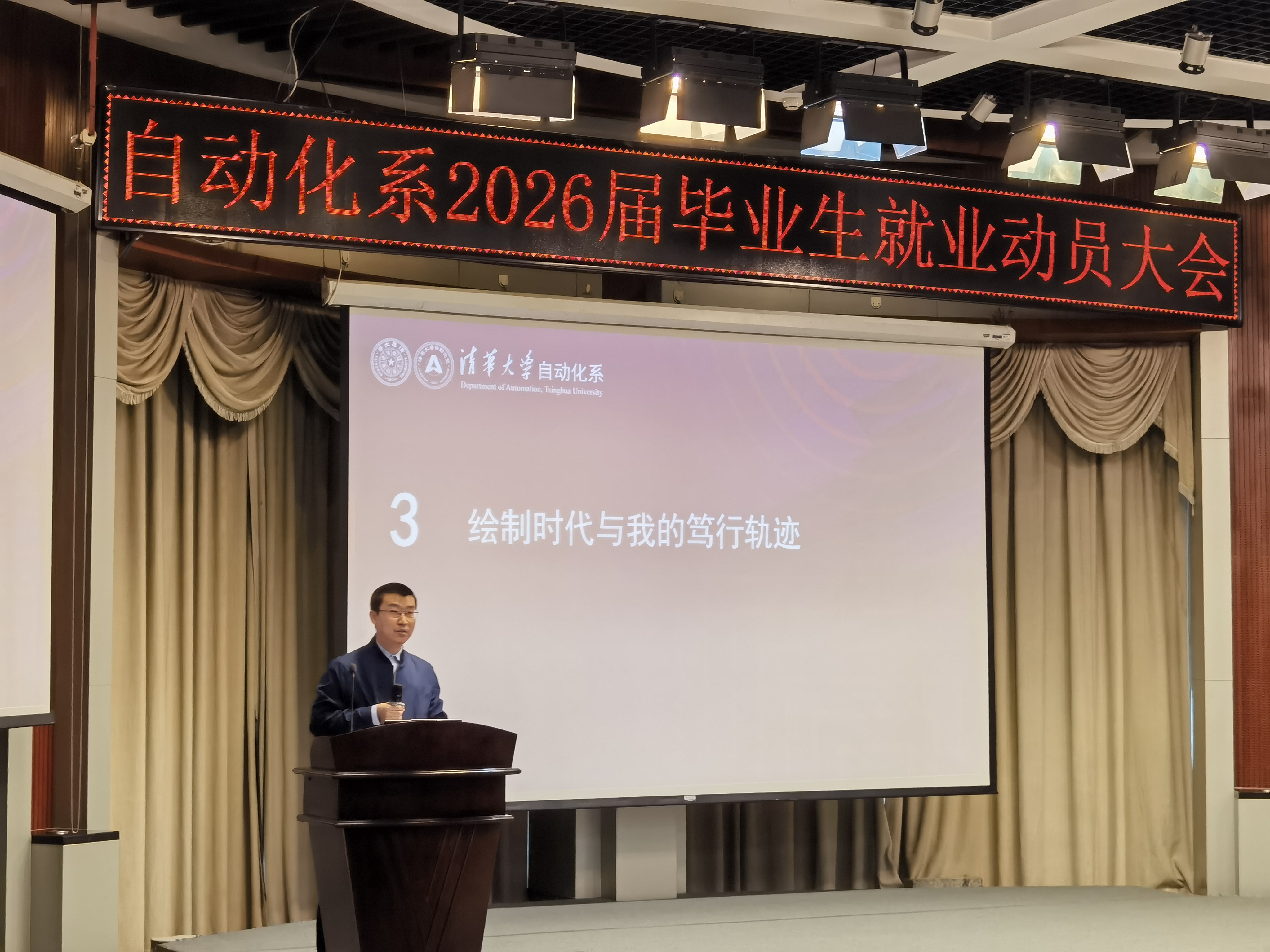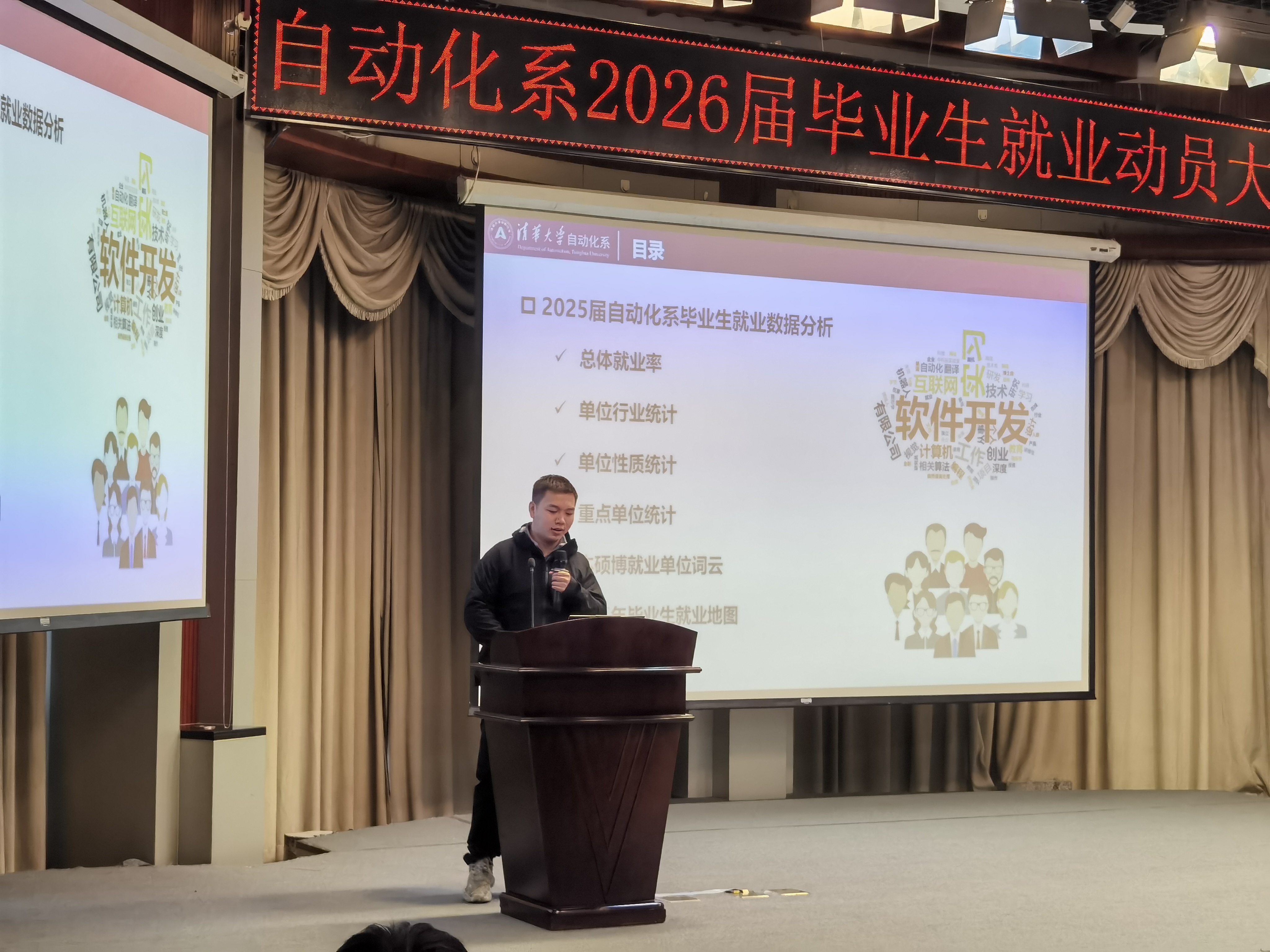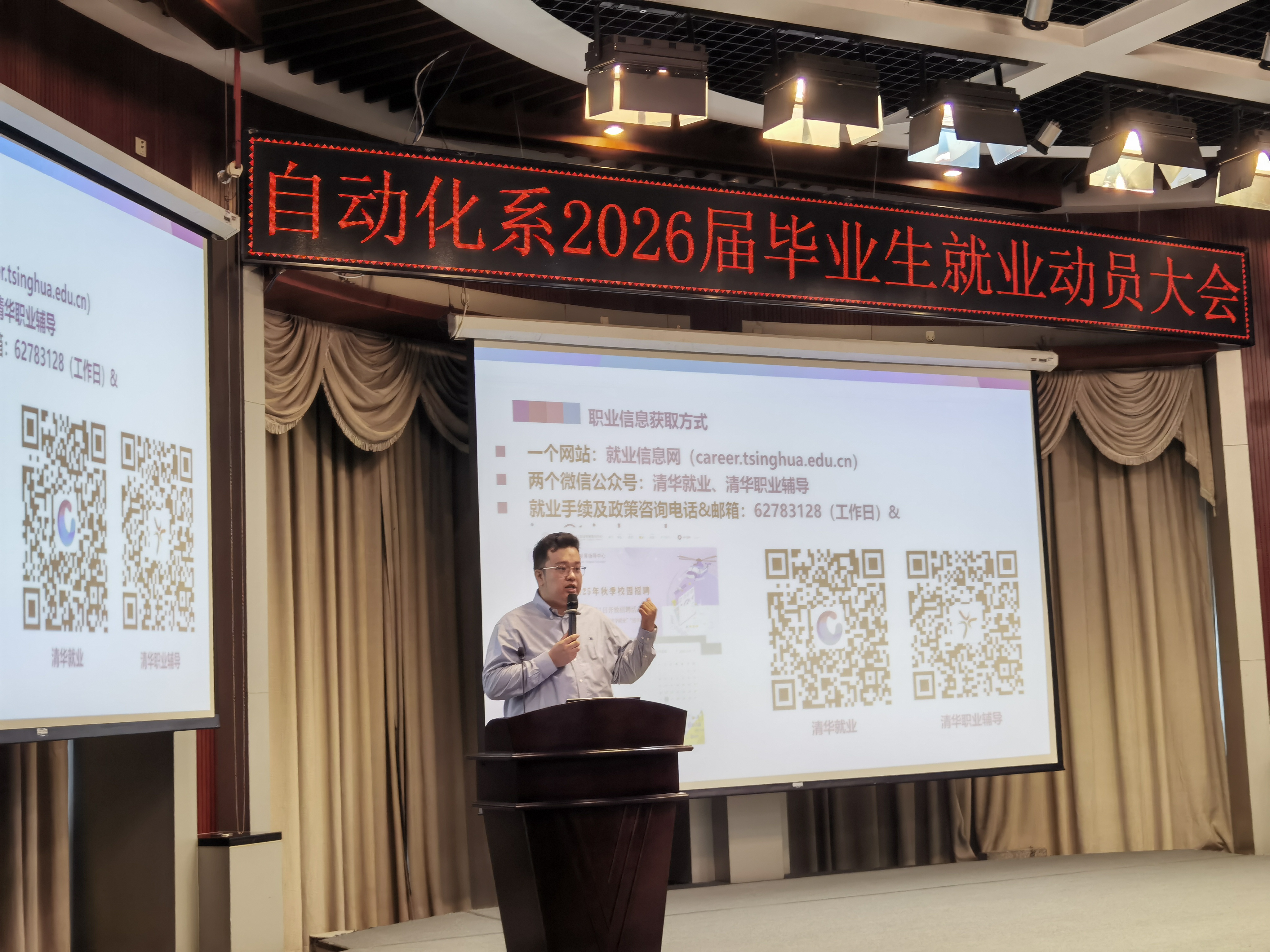 2025年10月17日上午,清华大学自动化系2026届毕业生就业动员大会在FIT楼多功能报告厅举行。清华大学自动化系党委副书记尚超,清华大学学生职业发展指导中心职业生涯教育办公室主任关晓壮,中国通号研究设计院集团基础技术研究院人工智能与安全技术研究所副所长、自动化系2012级博士系友郭天序出席动员会,150余名本硕博学生参加会议。会议由自动化系综合办公室王和君主持。