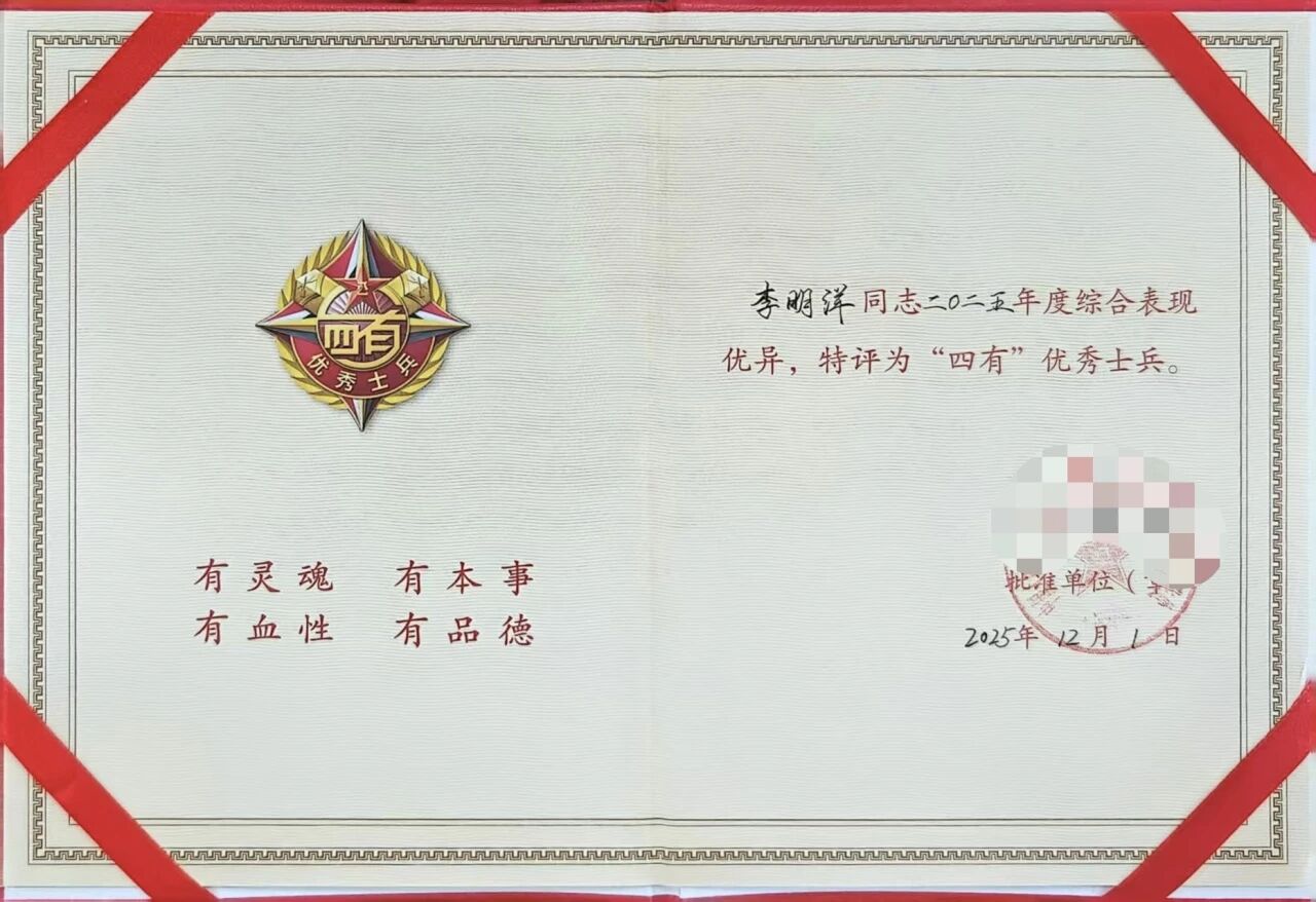 李明洋获评“四有”优秀士兵荣誉证书