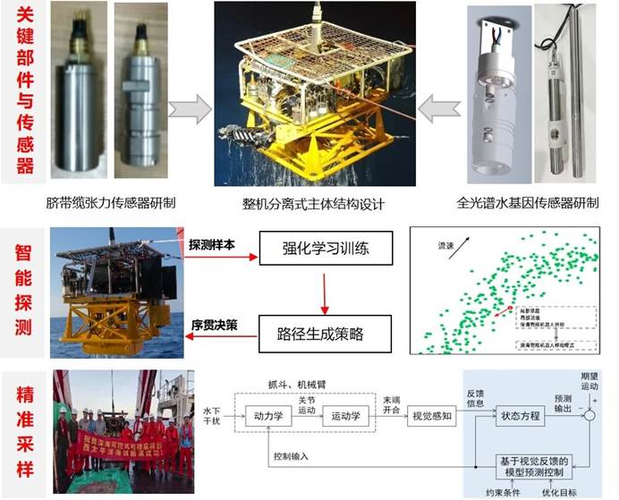 宋士吉团队研制出我国首台6000米深海智能探测与自主采样机器人,可实现150米半径范围内的自主移动。研究团队突破了样机总体设计、关键配套部件与传感器设计及制造、海底场源智能搜索、强化学习跟踪控制等多项关键技术难题。该机器人具备大范围粗略探测、小范围精细探测、精确地质采样等功能及整机智能的优势。