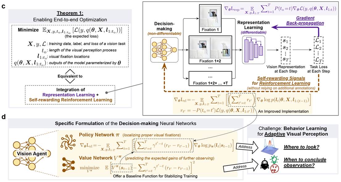 AdaptiveNN 的训练过程同时涉及连续变量(如从注视区域中提取特征)和离散变量(如决定下一次注视位置)的优化,传统反向传播算法难以直接处理这一混合优化问题。为此,研究团队在理论上提出了面向离散-连续混合优化问题的端到端求解方法,使 AdaptiveNN 能够高效地完成训练。具体而言,从期望优化目标出发,对整体损失函数进行分解,AdaptiveNN 的端到端优化过程可自然地分解为两项:第一项为表征学习目标(representation learning),对应于从注视区域中提取任务相关的特征;第二项为自激励强化学习目标(self-rewarding reinforcement learning),对应于优化注视位置的分布,驱使模型的主动注视行为实现最大化的任务收益。这一理论结果揭示了 AdaptiveNN 的内在学习规律:主动感知的优化本质上是表征学习与强化学习的统一。
