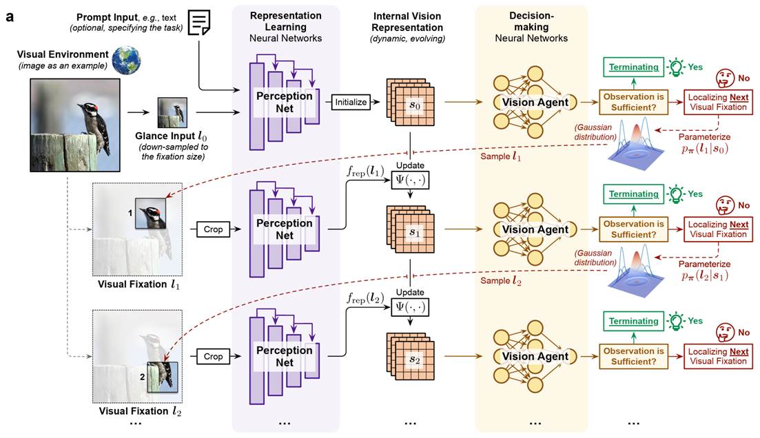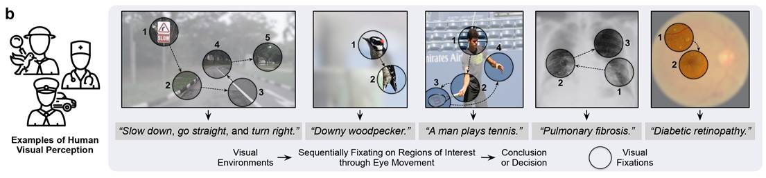人类视觉系统为突破上述瓶颈提供了重要启示:在观察复杂环境时,人眼不会一次性处理全部视场内的信息,而是通过一系列“注视”动作主动地、选择性地采样关键区域,以小范围高分辨率的感知逐步拼接出对视觉输入中有用信息的认知。这种自适应感知机制能在庞杂的视觉输入中快速筛取要点,大幅降低冗余计算,使得人类高度复杂的视觉系统能够高效、快速运行。无论外界场景多么复杂,人类视觉系统的能耗主要取决于注视带宽与注视次数,而非全局像素量。早在2015年,深度学习三位主要奠基人LeCun, Bengio 和 Hinton教授便在其合著的《Nature》综述论文“Deep Learning”中指出,未来的AI视觉系统应具备类人的、任务驱动的主动观察能力。然而近十年以来,这一方向仍缺乏系统性研究。