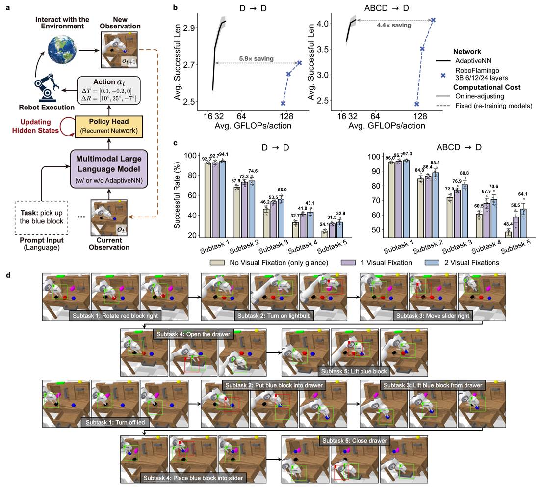 研究团队进一步将 AdaptiveNN 应用于具身智能的基础模型(视觉-语言-行为模型,VLA)。结果表明,该框架在复杂操作场景中显著提升了具身基础模型的推理与感知效率,在保持任务成功率的同时将计算效率提升 4.4 - 5.9倍。这一成果为解决具身智能系统长期面临的效率瓶颈提供了新的思路与技术路径。