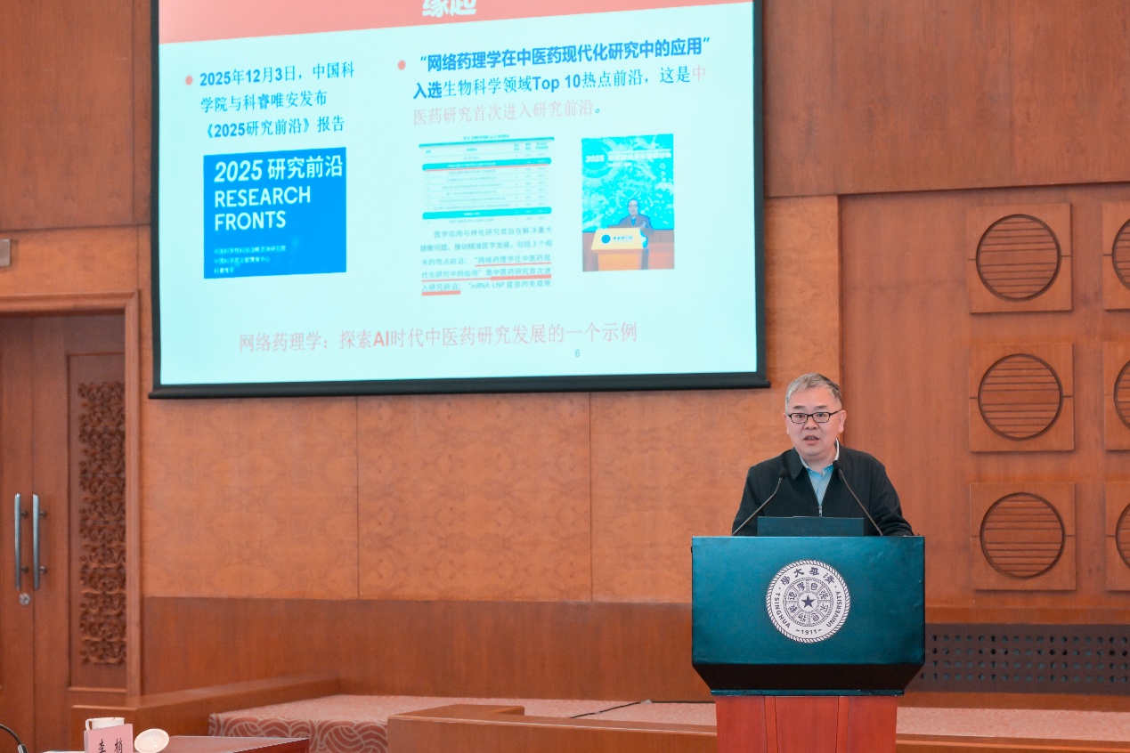 陈凯先首先介绍了会议背景。2025年12月,中国科学院科技战略咨询研究院、中国科学院文献情报中心和科睿唯安向全球联合发布《2025研究前沿》报告,报告中“网络药理学在中医药现代化研究中的应用”首次入选生物科学领域Top10热点前沿。陈凯先指出,中医药领域的研究热点不仅值得关注,更应该深入研究如何高质量推动发展。另一方面,当前人工智能的迅猛发展也为中医药领域的现代化和智能化转型带来机遇和挑战,会议也是为了研讨中医药现代化研究前沿现状和发展趋势,探寻未来新的突破方向。